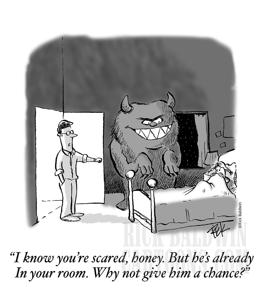 "Scared" cartoon by Rick Baldwin. New Yorker-style gag cartoon strip.