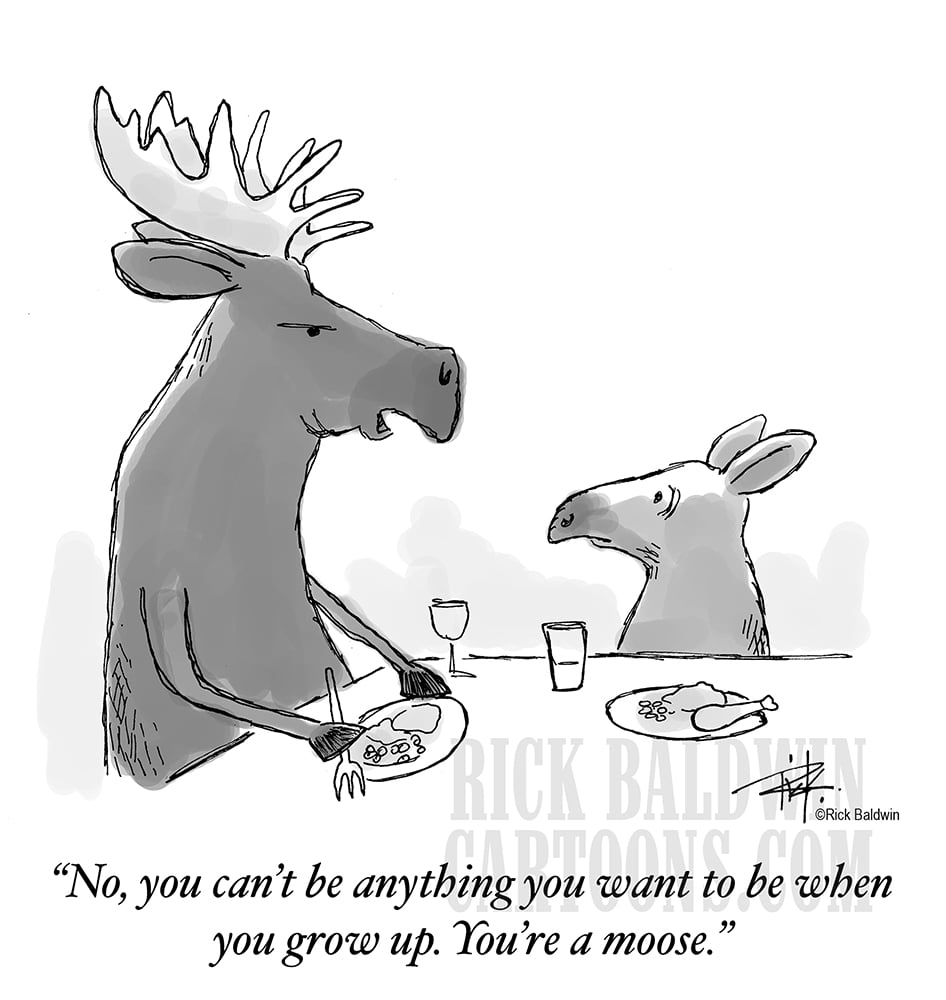"Moose" cartoon by Rick Baldwin. New Yorker-style gag cartoon strip.