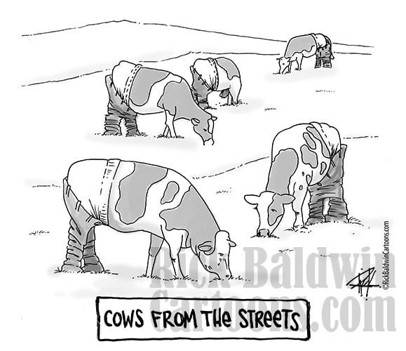 "Cows From The Streets" cartoon by Rick Baldwin. New Yorker-style gag cartoon strip.