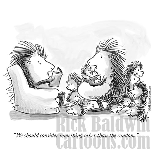A witty cartoon of a porcupine family discussing birth control and why condoms just don’t work for them. This funny animal cartoon blends humor and irony with a clever take on relationships, family life, and everyday challenges. Perfect for editorial use, health and wellness blogs, social commentary, or anyone who enjoys sharp, quirky cartoons about modern life.